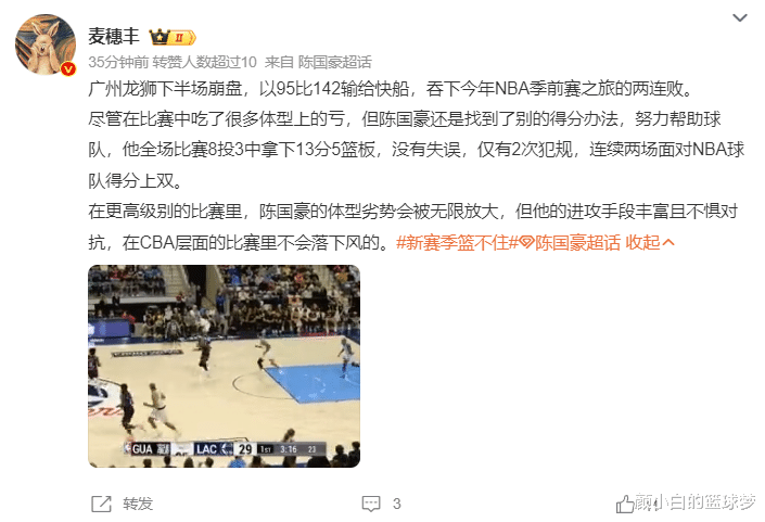 广东媒体人麦穗丰也评价了陈国豪的第二场季前赛:尽管比赛中体型上很吃亏,但陈国豪总是能想到得分的办法,努力帮助球队,连续两场面对NBA球队上双。